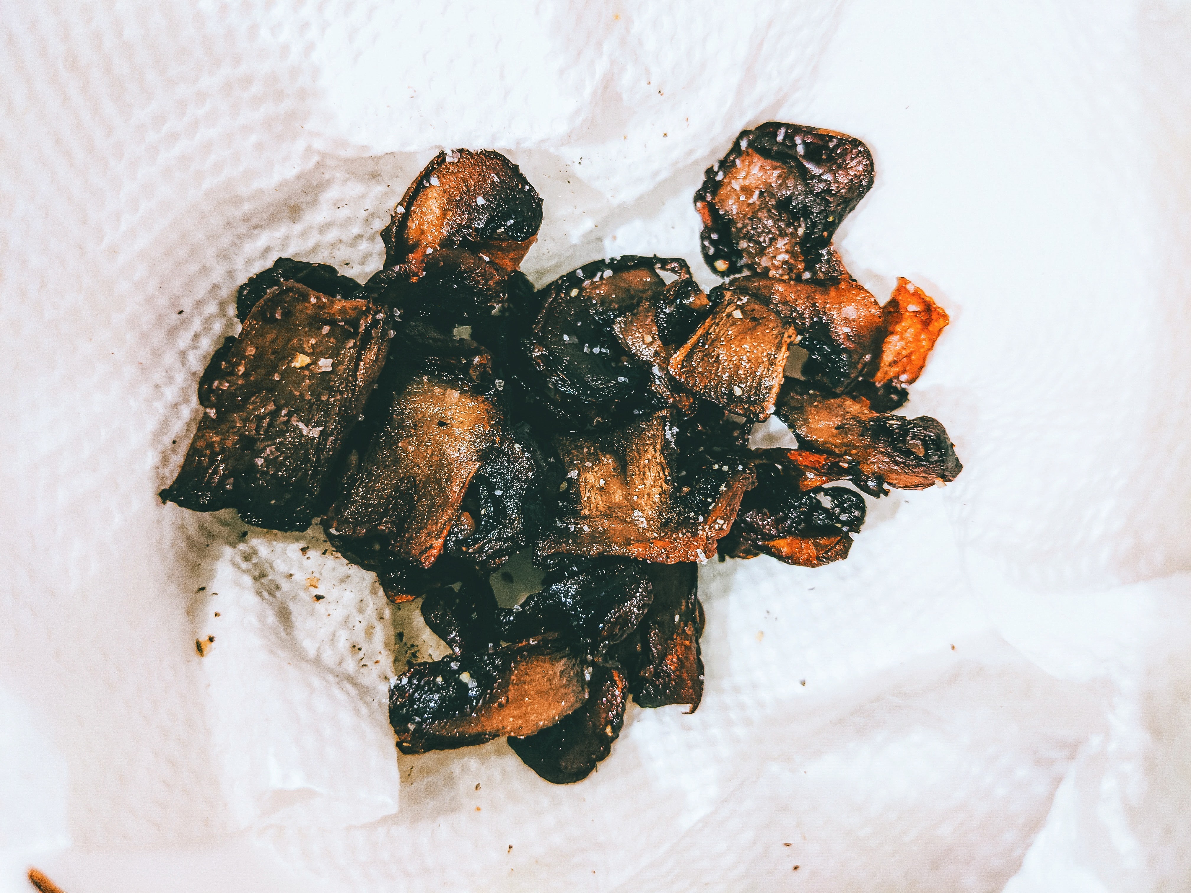 - Wash, dry, and slice the tips of the mushroom stems off (especially the tougher parts), and then chop the mushrooms up however you like. I like to slice them—thinly if I have time to kill, roughly if I don’t have the patience.