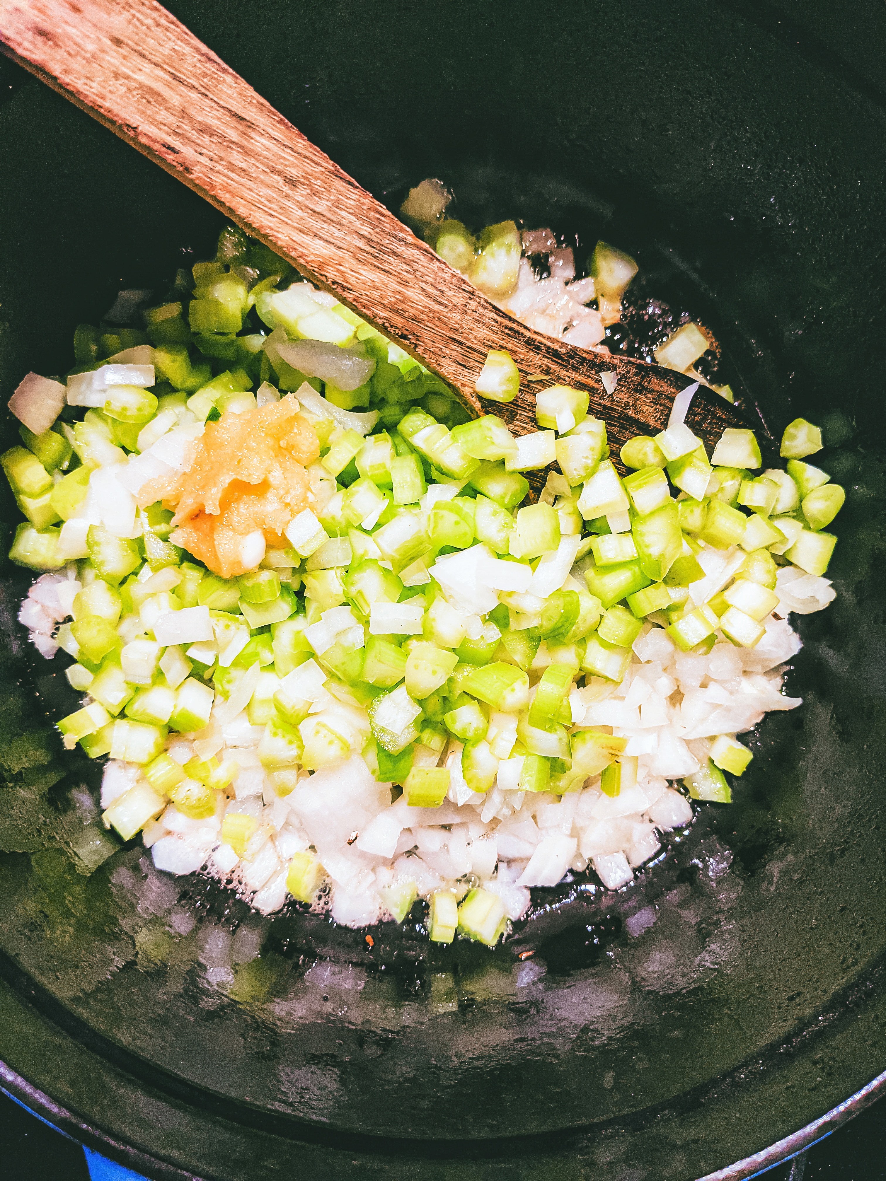 - Turn back to the pot, and add the remaining oil (or butter), keeping at medium-high heat. Dump in all the garlic, onions, and celery, and cook, stirring occasionally. This means until they begin to brown a bit. You’re not burning them, though. This may take about 10 minutes. Mix in a small pinch of salt.
